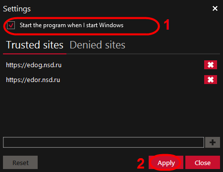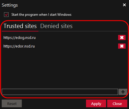 By default Web-client URL is specified in the trusted sites (https://edor.nsd.ru[1] (RSA), https://cabinet.nsd.ru/en (valid till 6 June, 2017)).