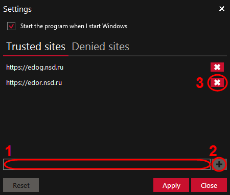 Websites lists can be edited. The principle of adding or deleting websites is the same for the trusted and denied list. To add the web-site, you need specify the URL in the field (Figure 4 [1]) and click the Add button (Figure 4 [2]).