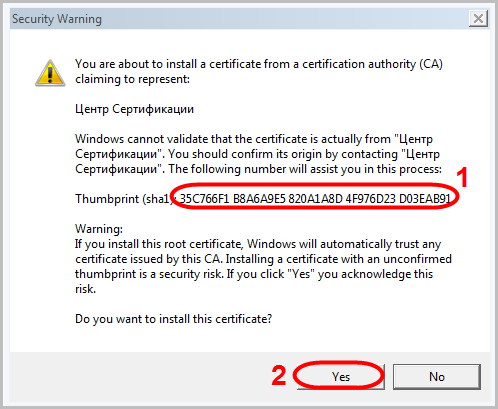 Upon the completion of import the Windows security window will open (Fig. 10), in which it is necessary to check the key print. Its number should match the number indicated on Fig. (10.1). If so – click Yes (Fig. 10.2).