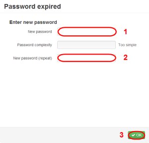 At first login into the system the Password has expired form will apeear, and user will need to enter new password (Fig. 2.1), then repeat the password (Fig. 2.2) and click OK.