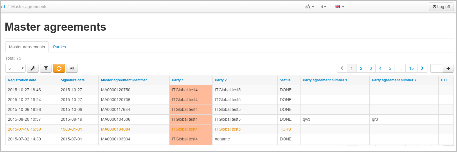 The web-client’s form of the Master Agreement contains records of registered and terminated MAs and list of organizations the counterparty has concluded MAs.