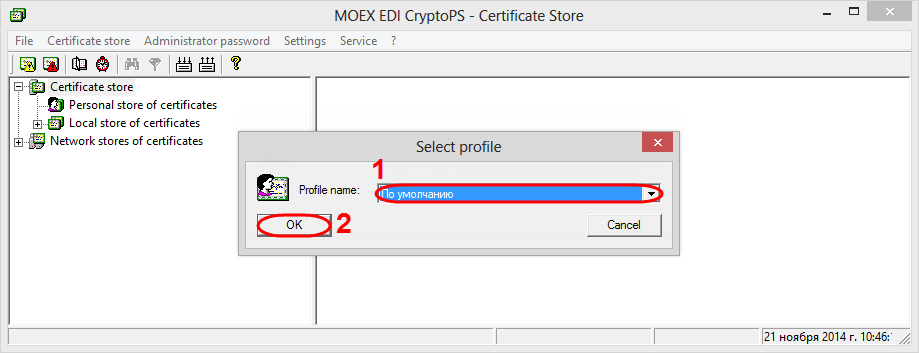 If there are several profiles, the profile selection dialog will pop up when starting a Certificates storage, where you will need to select the new profile and click the OK button (Fig. 2).
