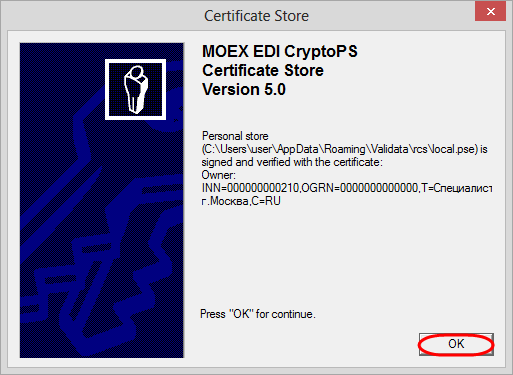 If you are not using the latest storage when running Certificates storage using the Start menu→All Programs→ ПКЗИ СЭД МБ (MOEX EDS DSSK)→Справочник сертификатов (Certificates storage), a message will appear informing that the personal storage is protected with the test certificate. You need to click the OK button in this window (Fig. 6).