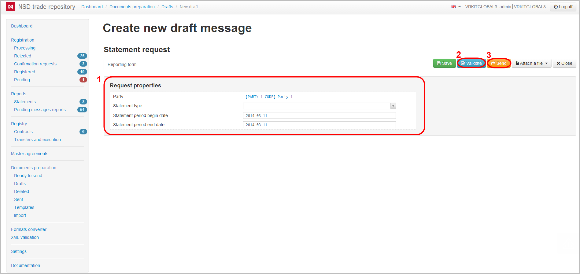 This will open a create/edit message form. Fill in the fields (Fig. 2.1), check the correctness of data input by clicking Validate (Fig. 2 .2). If the form is filled out correctly, click Send (Fig. 2.3).