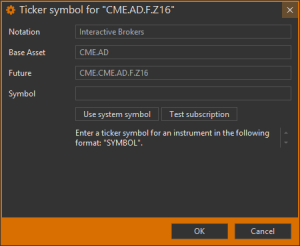 При вводе переменных код опциона будет автоматически преобразовываться по шаблону в значение, которое отобразится в столбце Symbol (рис. 56[3]). Для проверки наличия полученного кода в соответствующей торговой системе следует нажать кнопку Test subscription (рис. 56[2]). Если проверка прошла успешно, отобразится значок , если код некорректен – .