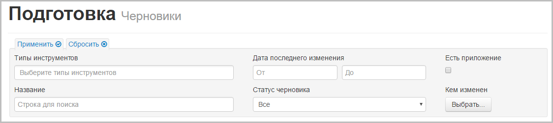 При нажатии на кнопку открывается панель с параметрами фильтрации. Для применения фильтра нужно нажать кнопку . В результате будет сформирована таблица с черновиками, отвечающими параметрам фильтра. Подробнее о настройке фильтров написано здесь.