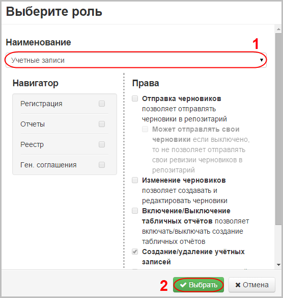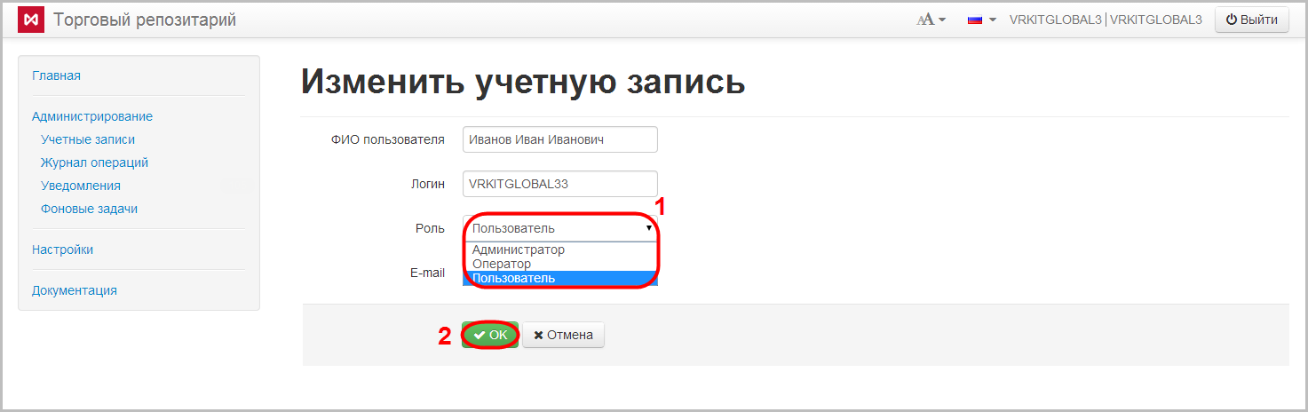 Первый способ: нажать кнопку . В результате откроется окно редактирования учетной записи, в котором необходимо в поле Тип учетной записи выбрать интересующее значение (рис. 5,1) и нажать кнопку ОК (рис. 5,2) для сохранения настроек.