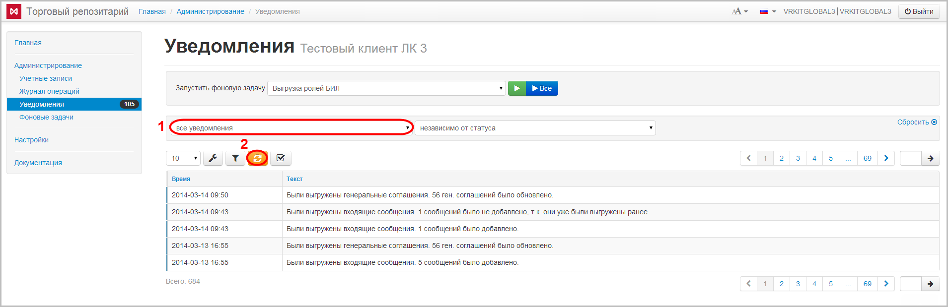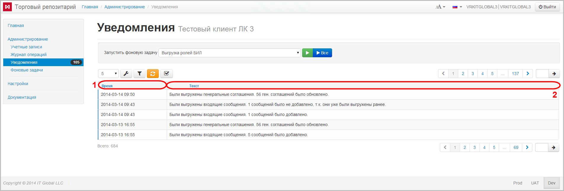 Форма Уведомления (рис. 14) отображает список системных операций и ошибок, которые возникли в процессе их выполнения. Уведомление содержит время (рис. 14,1) и текст операции (рис. 14,2). Уведомления отображаются в порядке поступления. Вновь поступающие сообщения выводятся в верхней части таблицы.