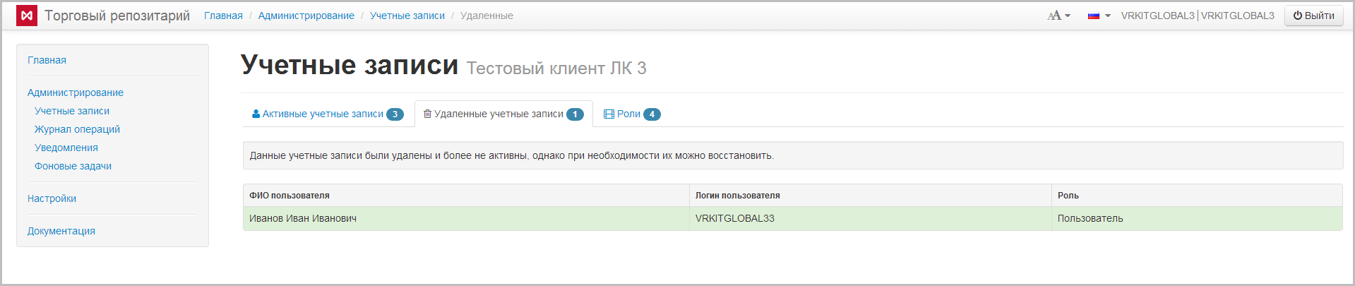 Во вкладке Удаленные учетные записи отображается список удаленных пользователей системы (рис. 8). Удаленную учетную запись можно восстановить, нажав на кнопку , которая отображается при наведении курсора мыши на строку в таблице. Восстановленная учетная запись отобразится во вкладке Активные учетные записи.