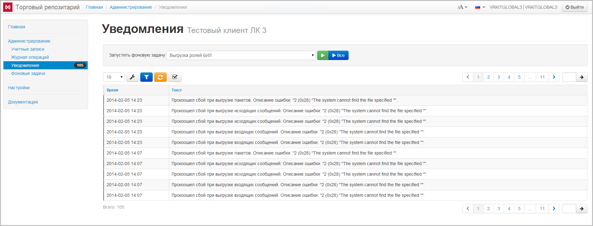 В форме Уведомления отображаются не только информационные сообщения, но и ошибки системы. Для их просмотра необходимо:
