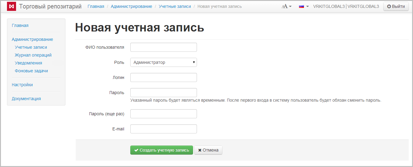 Для добавления нового пользователя в рамках одного участника (клиента репозитария) необходимо нажать кнопку Добавить учетную запись. В экранной форме Новая учетная запись (рис. 3) следует заполнить: