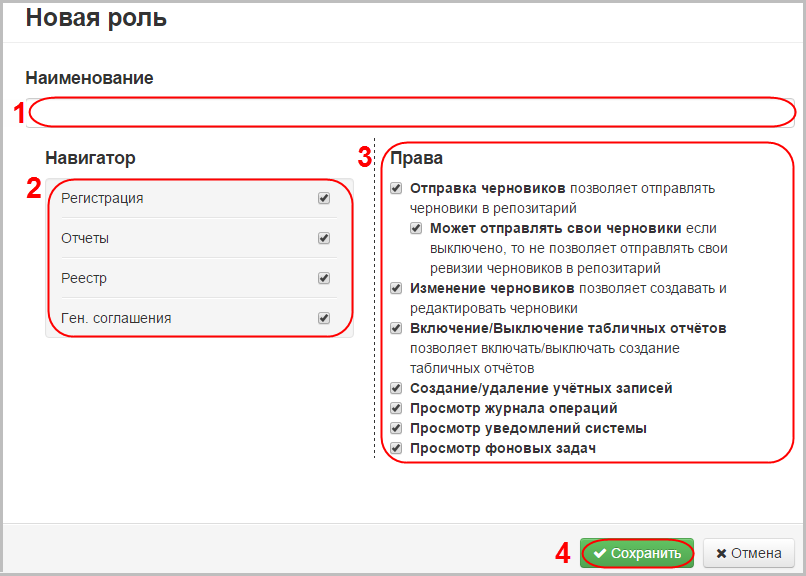 Права роли можно менять. При нажатии на кнопку открывается окно настройки, в котором следует внести необходимые изменения и нажать кнопку Сохранить.