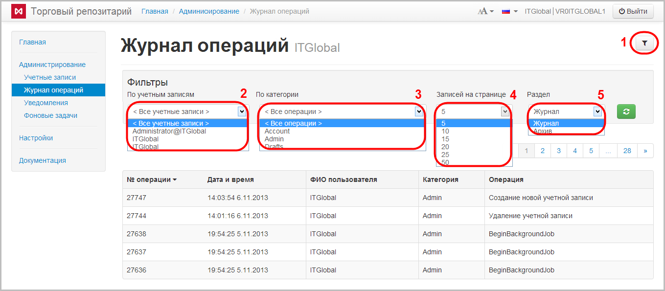 | 4 | Записи на странице | Фильтр используется для настройки количества отображаемых операций на странице |