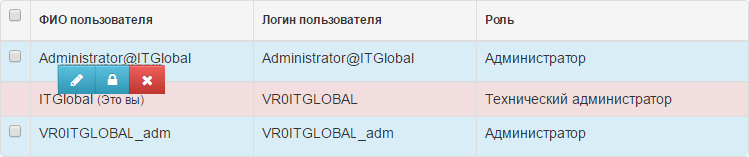Редактирование учетных записей производится с помощью функциональной панели, которая всплывает при наведении курсора мыши на строку в таблице учётных записей (рис. 4)