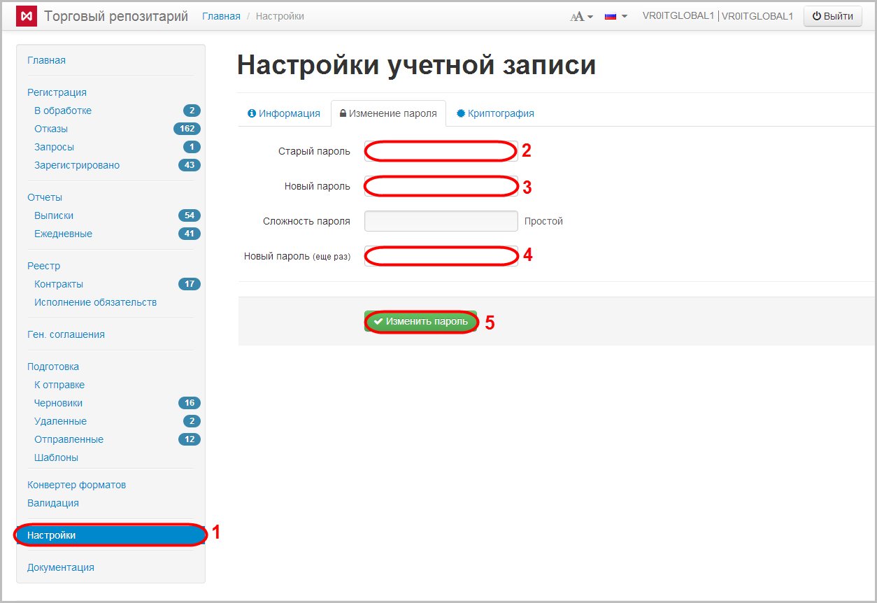 • нажать кнопку Изменить пароль (рис. 1,5).