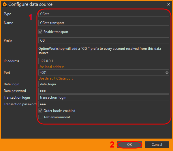| Enable transport | Если снять переключатель, Cgate будет добавлен в список доступных источников, но не будет подключен (см. раздел Деактивация источника) |