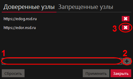 По умолчанию в списке доверенные узлы указан URL Web-кабинета https://edog.nsd.ru (ГОСТ, промышленный контур), https://edor.nsd.ru (RSA, промышленный контур).
