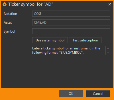 На форме (рис. 2) отображается пример символа в формате текущего источника данных. Для проверки наличия символа в торговой системе следует нажать кнопку Test subscription (рис. 2).