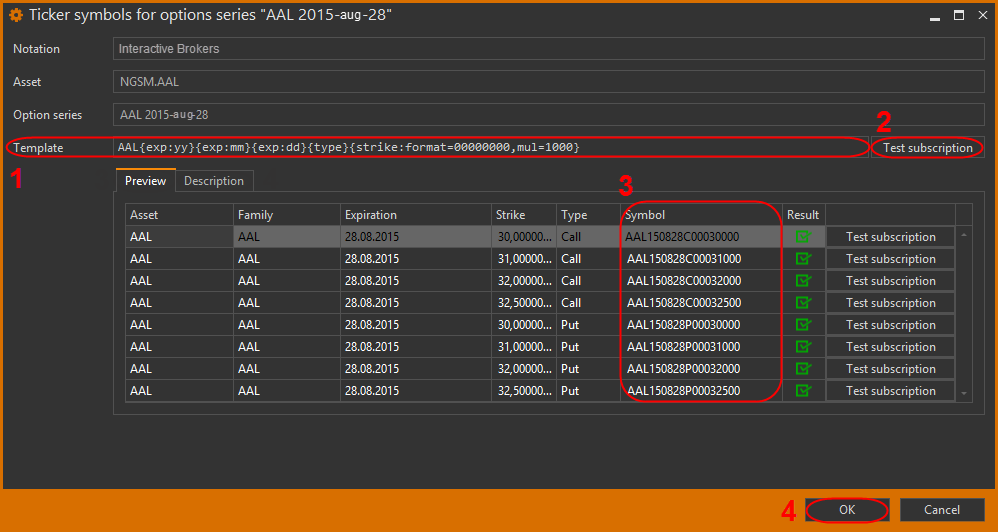 Таким образом, в поле Template (рис. 6[1]) добавляем следующие операторы: AAPL {exp:yy}{exp:mm}{exp:dd}{type}{strike:mul=1000,format=00000000}.